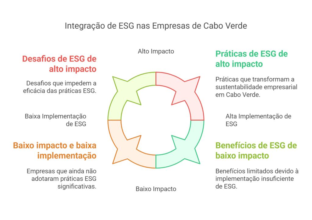 Um dos principais desafios enfrentados pelas empresas em Cabo Verde na implementação de práticas ESG é a limitação de recursos e infraestrutura. A falta de acesso a tecnologias avançadas e a necessidade de investimentos significativos podem dificultar a adoção de práticas sustentáveis. No entanto, parcerias estratégicas com organizações internacionais podem ajudar a superar estas barreiras, proporcionando o suporte necessário para a implementação de tecnologias sustentáveis (Redes para o Desenvolvimento).